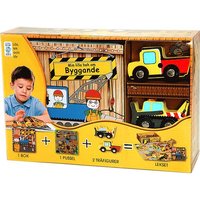 Lek och lär. En rolig aktivitetslåda som innehåller: en bok på 64 sidor med text och bilder om vad om händer på en livlig byggarbetsplats två fina byggmaskiner i trä olika kartongdelar som uppmuntrar till en fantasifull lek använd förpackningen! L....